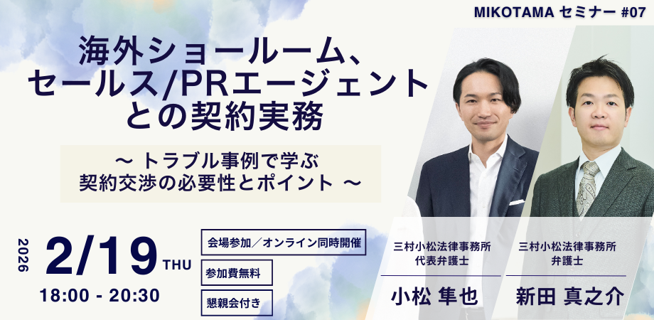『海外ショールーム、セールス / PRエージェントとの契約実務 ~トラブル事例で学ぶ 契約交渉の必要性とポイント~』を開催します 【2026年2月19日(木) 18:00~】